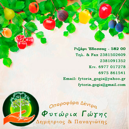 Οπωροφόρα: 1) Ροδακινιές, 2) Νεκταρινιές, 3) Κερασιές, 4) Βυσσινιές, 5) Βερικοκιές, 6) Δαμασκηνιές, 7) Κορομηλιές, 8) Μηλιές, 9) Αχλαδιές, 10) Συκιές, 11) Μουσμουλιές-Μεσπιλιές, 12) Ροδιές, 13) Κυδωνιές, 14) Λωτοί (όλα τα παραπάνω είδη διατίθενται σε διάφορες ποικιλίες και υποκείμενα).